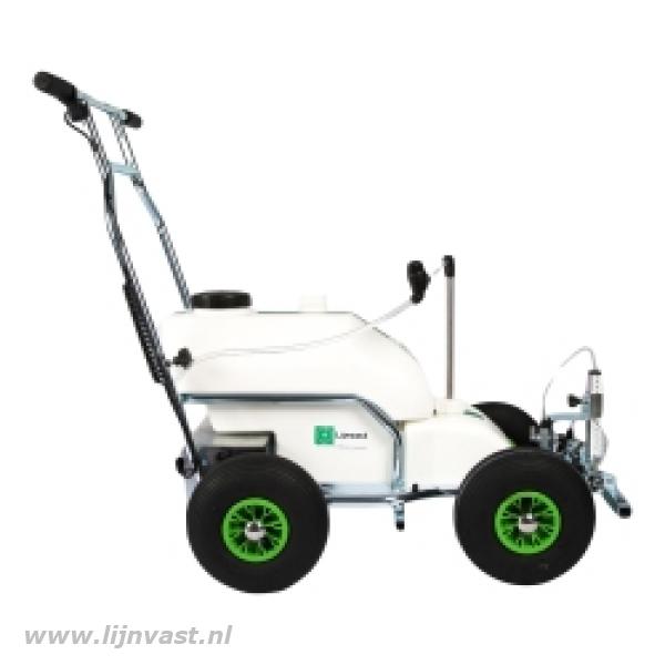 De markeerwagen electro is geschikt voor elke gebruiker. U kunt het spuitgedeelte aan de voozijde, de achterzijde of aan de linker- of rechterzijkant plaatsen. De handgrepen zijn in hoogte, afzonderlijk, instelbaar en zijn bovendien uitneembaar. Aan de achterzijde kunt u met behulp van de kraan de werkdruk tussen 1 en 3,5 bar instellen. De tank heeft een inhoud van 25 liter.