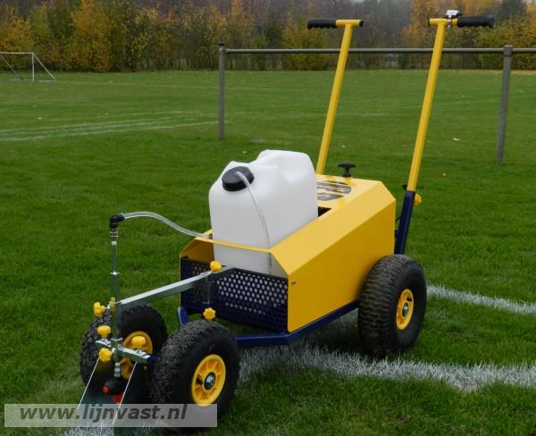 De markeerwagen electro is geschikt voor elke gebruiker. U kunt het spuitgedeelte aan de voozijde, de achterzijde of aan de linker- of rechterzijkant plaatsen. De handgrepen zijn in hoogte, afzonderlijk, instelbaar en zijn bovendien uitneembaar. Aan de achterzijde kunt u met behulp van de kraan de werkdruk tussen 1 en 3,5 bar instellen. De tank heeft een inhoud van 25 liter.